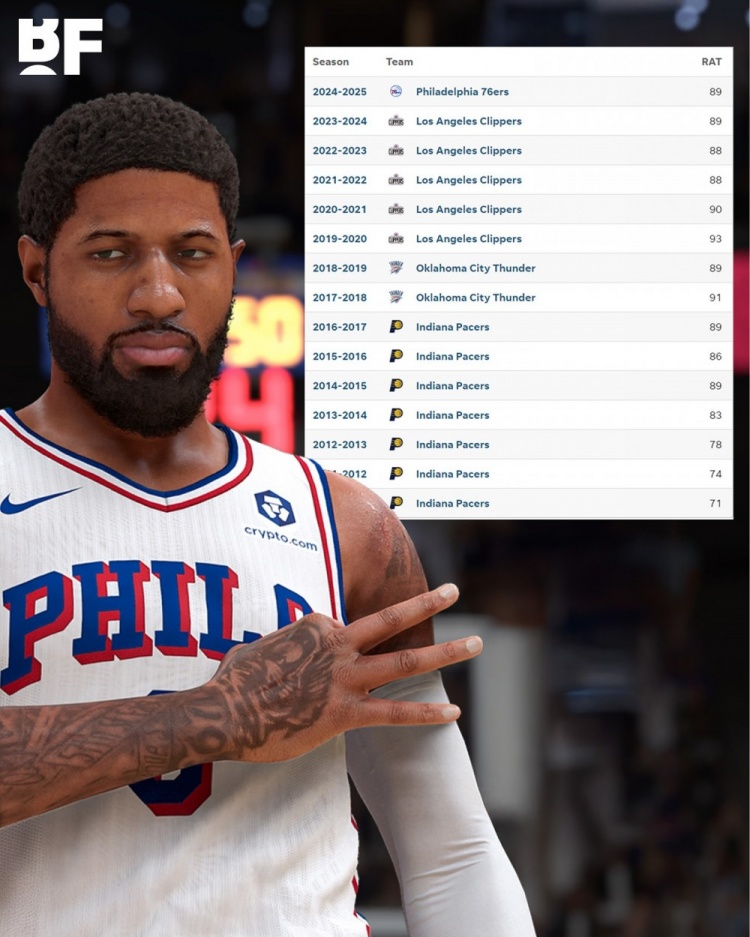 乔治此前连续9年2k评分88+ 今年81