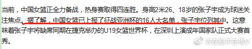 根据深圳商报的报道,中国女篮上报征战亚洲杯的16人大名单当中,张子宇位列其中。