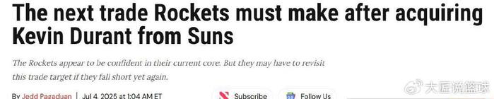 8换1杜兰特后,火箭还能卖5首轮!美媒晒9换1方案:申京换字母哥