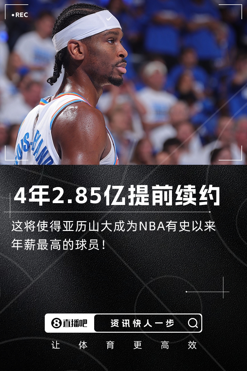 💥Shams:亚历山大4年2.85亿提前续约雷霆!创历史最高年薪