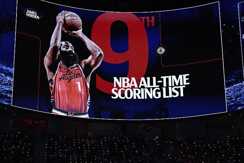 在历史得分榜上,位列哈登之前的是另一位传奇中锋威尔特·张伯伦,目前两人之间尚有2000多分的差距。