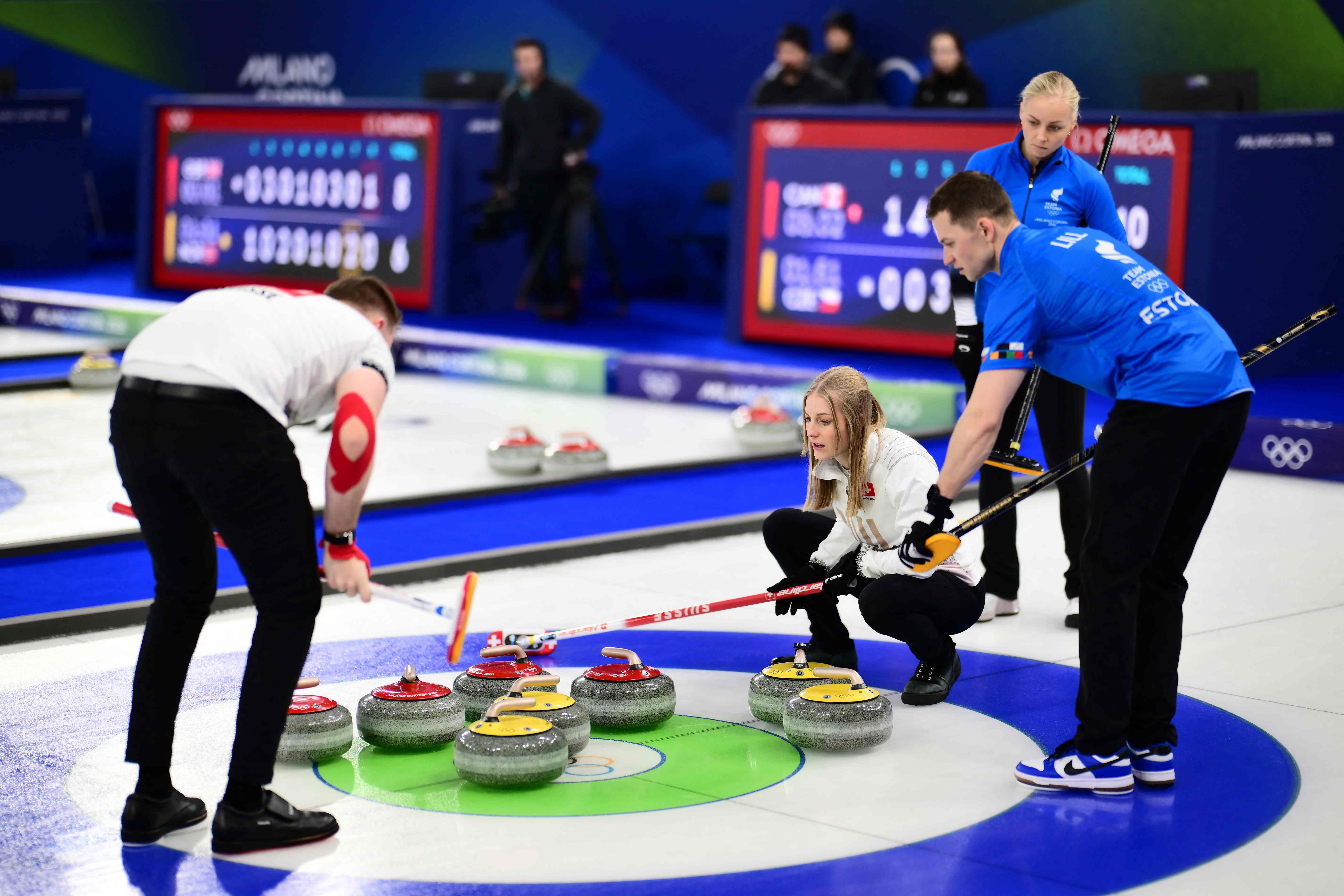 2月4日,在米兰-科尔蒂纳冬奥会首个比赛日,爱沙尼亚队与瑞士队参加冰壶混双比赛。(法新社)